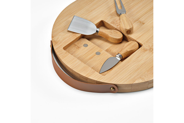 В мире кулинарных удовольствий мы представляем эту бамбуковую доску. Диаметром 30 см и толщиной 2,6 см, она также оснащена ручкой. Кроме того, в комплект входят три предмета столовых приборов из нержавеющей стали.