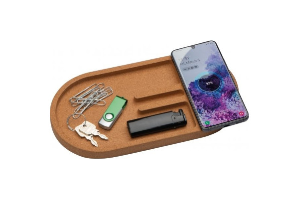 Стильный органайзер для стола из пробки с индукционной зарядкой (10 ватт) из бамбука и USB-C зарядным кабелем. Привлекательный акцент на любом столе.